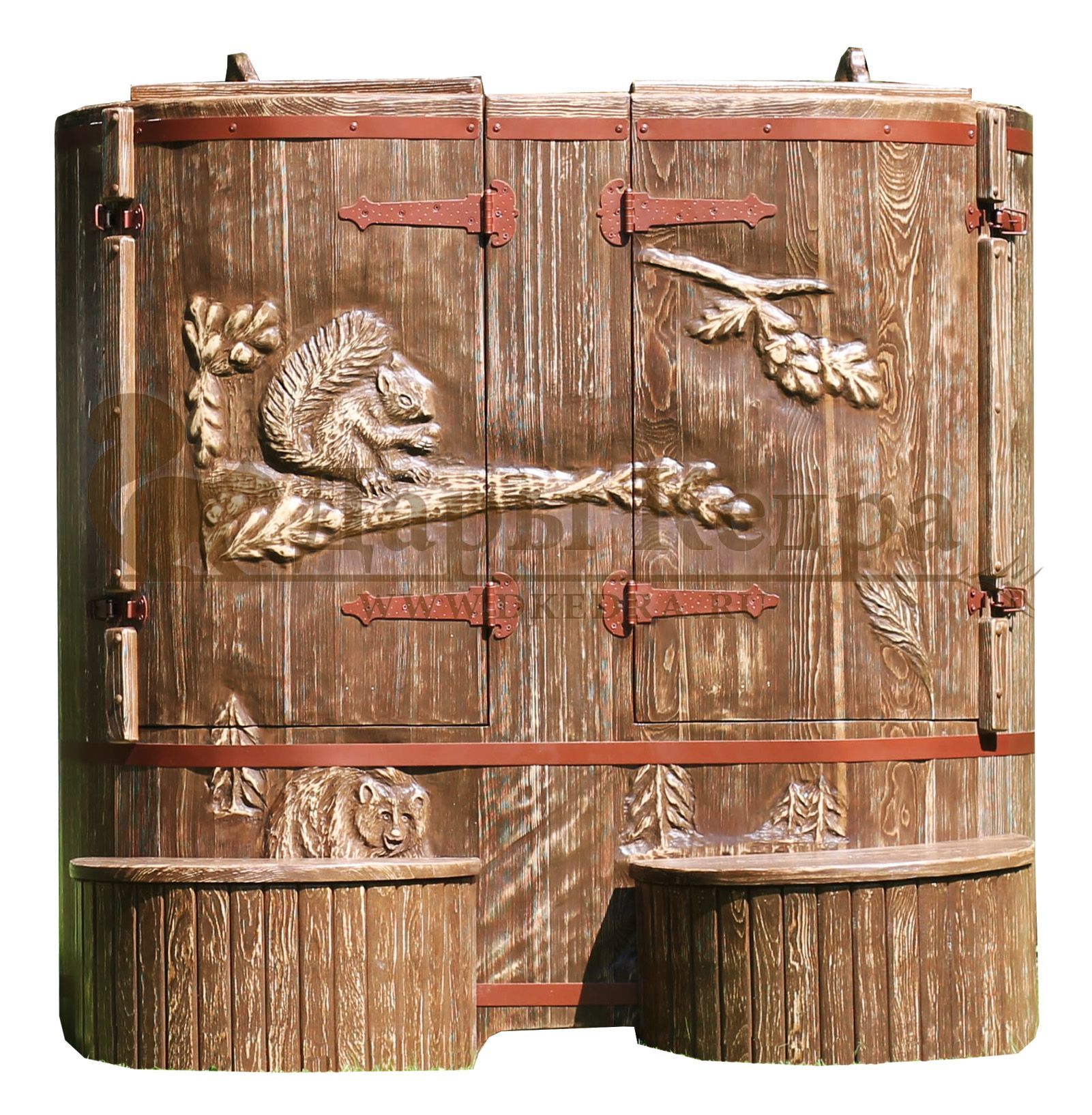 Кедровая бочка (фитобочка) «Звери в лесу» Любая модель эксклюзивной фитобочки - это выбор не только дизайнеров и ценителей красоты, но и тех, кто любит нестандартный подход в любых деталях. С оригинальной авторской фитобочкой Дары Кедра ваша квартира, дом или салон красоты станут объектом всеобщего внимания, ведь такая фитобочка - это не просто смело, красиво и достойно, это еще и очень полезно для Вашего здоровья! Художественная резьба это ручная работа, выполняется разными мастерами и каждый рисунок неповторим. Вы можете выбрать предложенные варианты резьбы или подобрать изображение и мы предложим вам подходящий эскиз. На сайте представлены наши работы в качестве примера. Каждая резьба рассчитывается индивидуально и может быть нанесена на любую модель фитобочки. Эксклюзивная фитобочка может быть представлена в разной цветовой гамме: После того, как цвет фитобочки выбран, необходимо определиться с вариантом резьбы (или предложить свой): Фитобочку можно также декорировать канатной веревкой в места обручей из нержавеющей стали (оплачивается дополнительно).