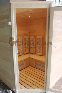 Это специально оборудованная кедровая кабина для прогрева тела человека сухим теплом. Воздух в таких парных не нагревается. Инфракрасные лучи воздействуют на тело, равномерно прогревая мышцы, суставы и органы. Керамические излучатели похожи на лампы, имеют высокую температуру нагрева, поэтому защищены противоожоговыми решетками. Тело человека в таких саунах нагревается интенсивнее. Работает кабина за счет электричества. Установка сауны в угол, позволяет рационально использовать пространство помещения. Подходит как для домашнего использования, так и для коммерции.